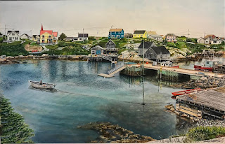 Then a couple of months ago I painted Peggy's Cove, which is located in Nova Scotia. My sister and brother in law vacationed there and gave me this great photo of Peggy's Cove to memorialize for them. A really fun painting to create...the colors, the mood, the setting were real special.